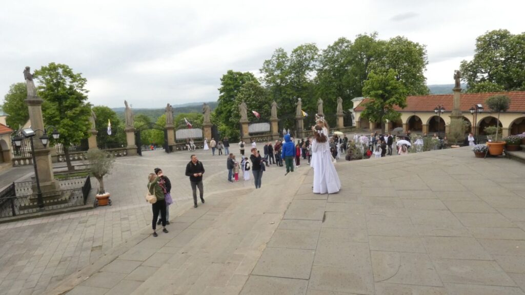 10 maja , czyli tydzień po uroczystości Pierwszej Komunii św. dzieci z naszej Parafii wyjechały na jednodniową pielgrzymkę do Kalwarii Zebrzydowskiej oraz Wadowic. Punktualnie o godzinie 6 rano autobus z parkingu przed kościołem odjechał z grupą dzieci oraz ich rodzicami i opiekunami w stronę Kalwarii Zebrzydowskiej. O godzinie 11.00 w Kalwaryjskim Sanktuarium rozpoczęła się msza św. z udziałem naszych pielgrzymów. Nasza grupa została przywitana imiennie przez ojca z zakonu Bernardynów, opiekujących się tym sanktuarium. We mszy św. uczestniczyły również grupy dzieci komunijnych z innych parafii. Po nabożeństwie była możliwość przejścia przez kaplicę z cudownym obrazem Matki Bożej Kalwaryjskiej. W południe autokar ruszył w stronę Wadowic. Po niespełna pół godzinie grupa pielgrzymów wysiadała na parkingu w mieście rodzinnym Jana Pawła II. W programie pielgrzymki było między innymi zwiedzanie muzeum św. Jana Pawła II, gdzie zwiedzający mogli zapoznać się z historią życia Papieża Polaka oraz zwiedzić jego rodzinny dom, w którym przyszedł na świat 18 maja 1920 roku. Był też czas na odwiedzenie dawnej cukierni Hagenhubera, gdzie Karol Wojtyła z rówieśnikami chadzał na kremówki. Pomimo nieciekawych prognoz, pogoda wytrzymała i bez poważniejszych problemów udało się zrealizować program pielgrzymki. Grupie towarzyszył ks. Paweł z Parafii w Pisarowcach, ubogacając wokalnie program imprezy. Organizacja pielgrzymki była zasługą siostry Tymotei, która przygotowywała dzieci do uroczystości pierwszokomunijnej. O godzinie 21.30 cała grupa szczęśliwie dotarła na parking przed kościołem.